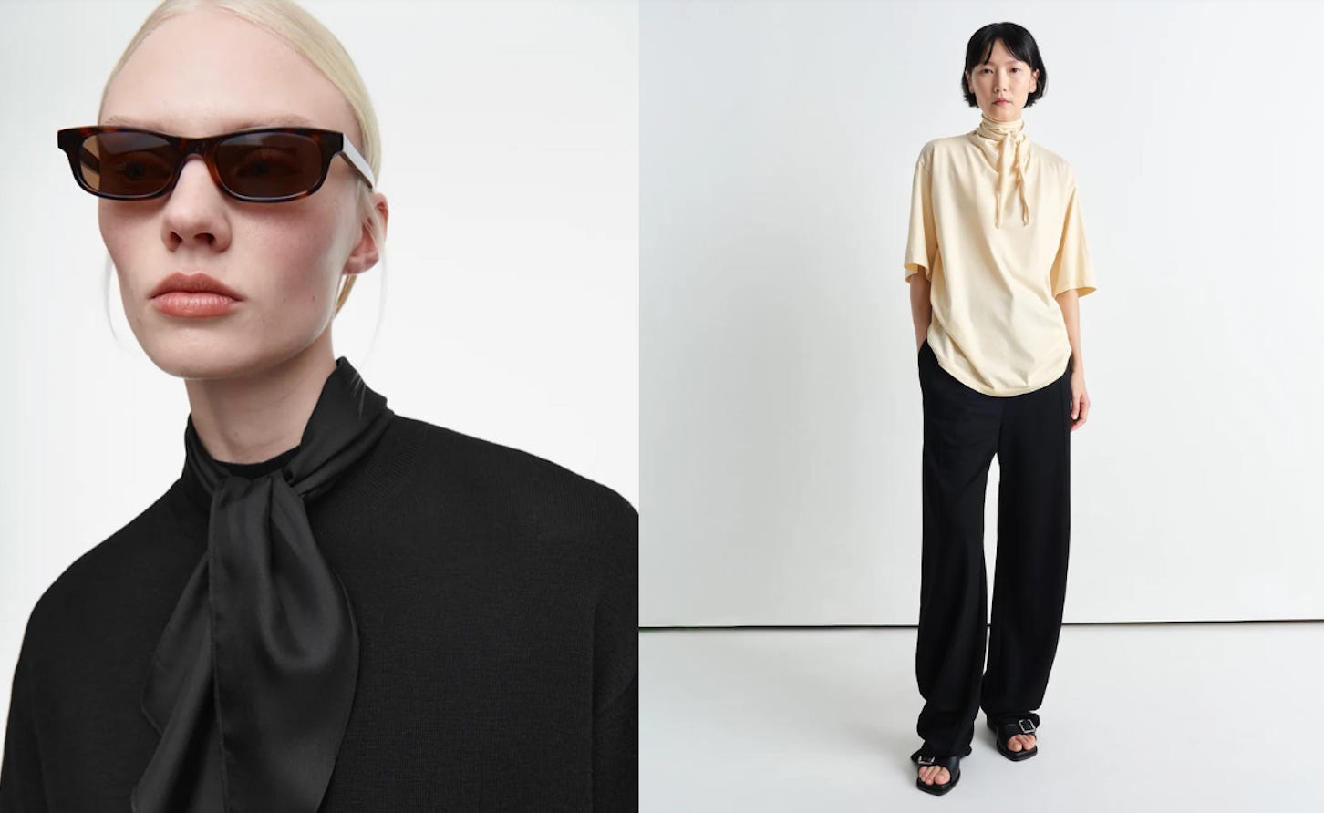 This week's new arrivals included two great scarf-detail tees. We’ve learned that an outfit can be elevated by adding a layer or an accessory before leaving the house. I love a pragmatic design that saves you from remembering to do that. The COS version is merino wool contrasted with a silk scarf. The Lemaire one is 100% cotton jersey with a high neck.