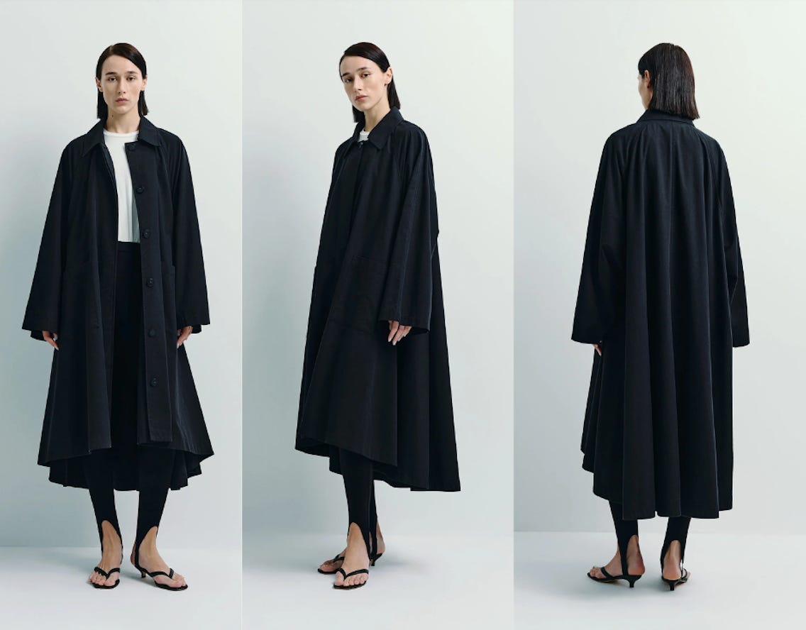 The netted and see-through slip-on shoe is back for a third summer. You’ll find them at diverse price points, from Reformation to Khaite. The pragmatic in me worries about the mesh and crochet versions faring poorly after a few weeks of pounding the dirty pavement. Totême added these woven leather flats to their Spring lineup. With a similar sock silhouette, these seem like they would be more durable. Other notable additions include this 100% silk cape knit and this striking lambskin suede panelled coat.