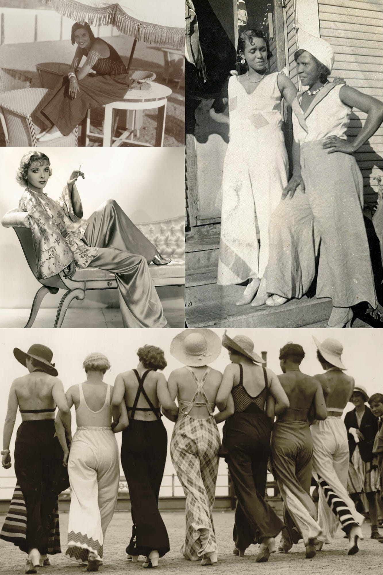 While suffragists advocated women’s pants as early as the 1850s during the Dress Reform movement, the popularization of wide-legged pants by women occurred in the late 1920s and 1930s through loungewear and beachwear. High society saw lounge pajamas, or lounjamas, as an off-duty staple they could wear when lounging and hosting at-home social events. Beach pajamas had widespread appeal. Women wore them when playing sports or on vacation, as they allowed more ease of movement than skirts and stockings did.