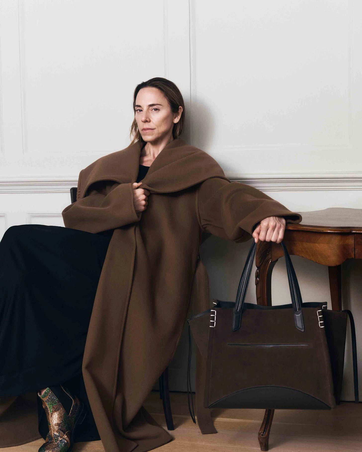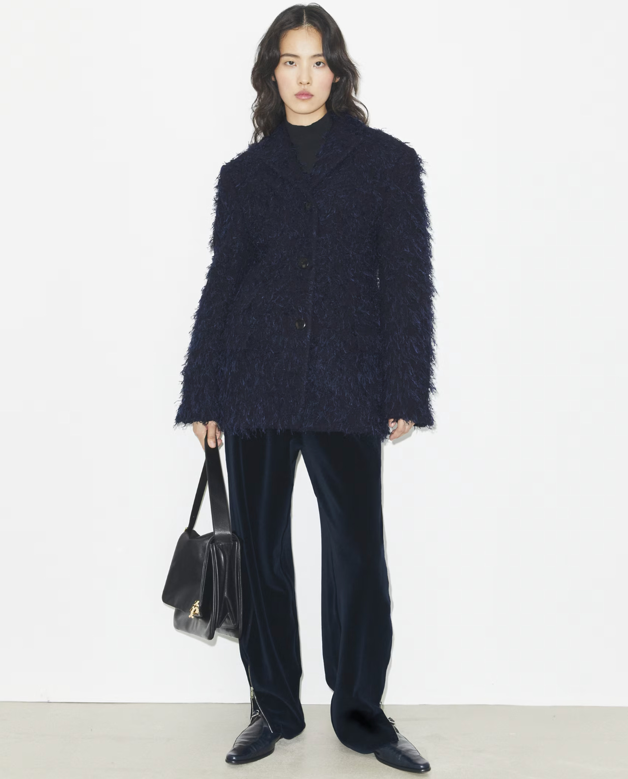 - Tory Burch recently released the handbag jacket in leather and denim, a collarless biker covered in pockets and carabiner clips. Our new editor, Juno, has always loved the deconstructed look (to the point that she often adds zips and exposed stitching to her clothes), so she was immediately drawn to this piece. If you’re looking for something for the winter months, we would advise getting the leather iteration in a size up so you can layer it over a sweater, or opting instead for this ink wool blazer with a fringe-effect, a smart but warm option for bouncing between meetings on cold days.