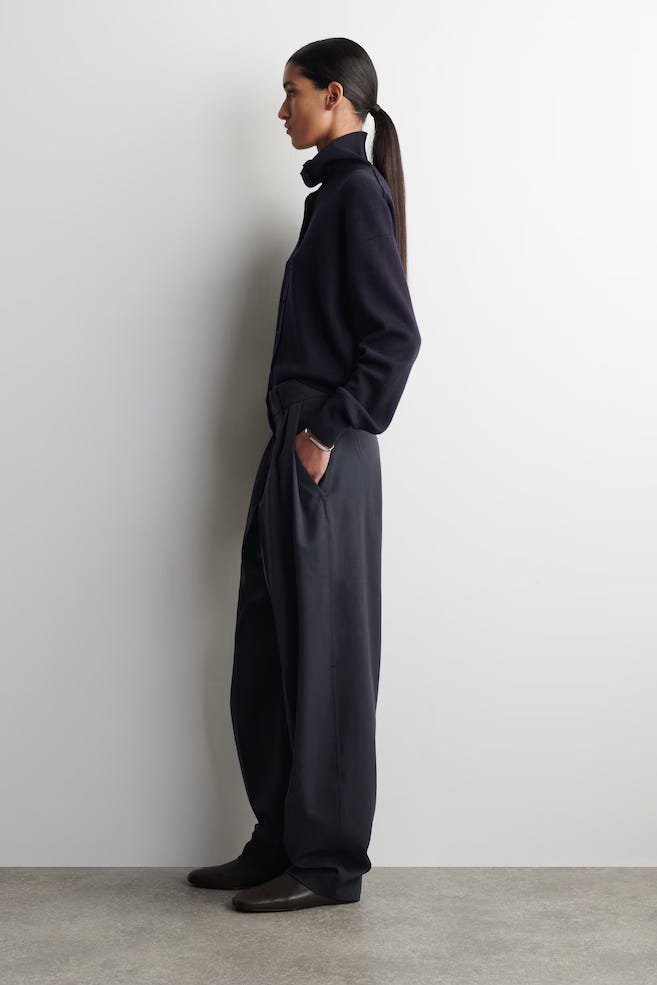Tulip is the shape of bottoms that feels most current. COS’ newest arrivals address the trend straightforwardly with this pair of tulip pleated wool pants in black and navy, and a pleated wool tulip midi skirt. This 100% silk black dress is a keep-and-wear-forever for whoever snags the few units left in each size.