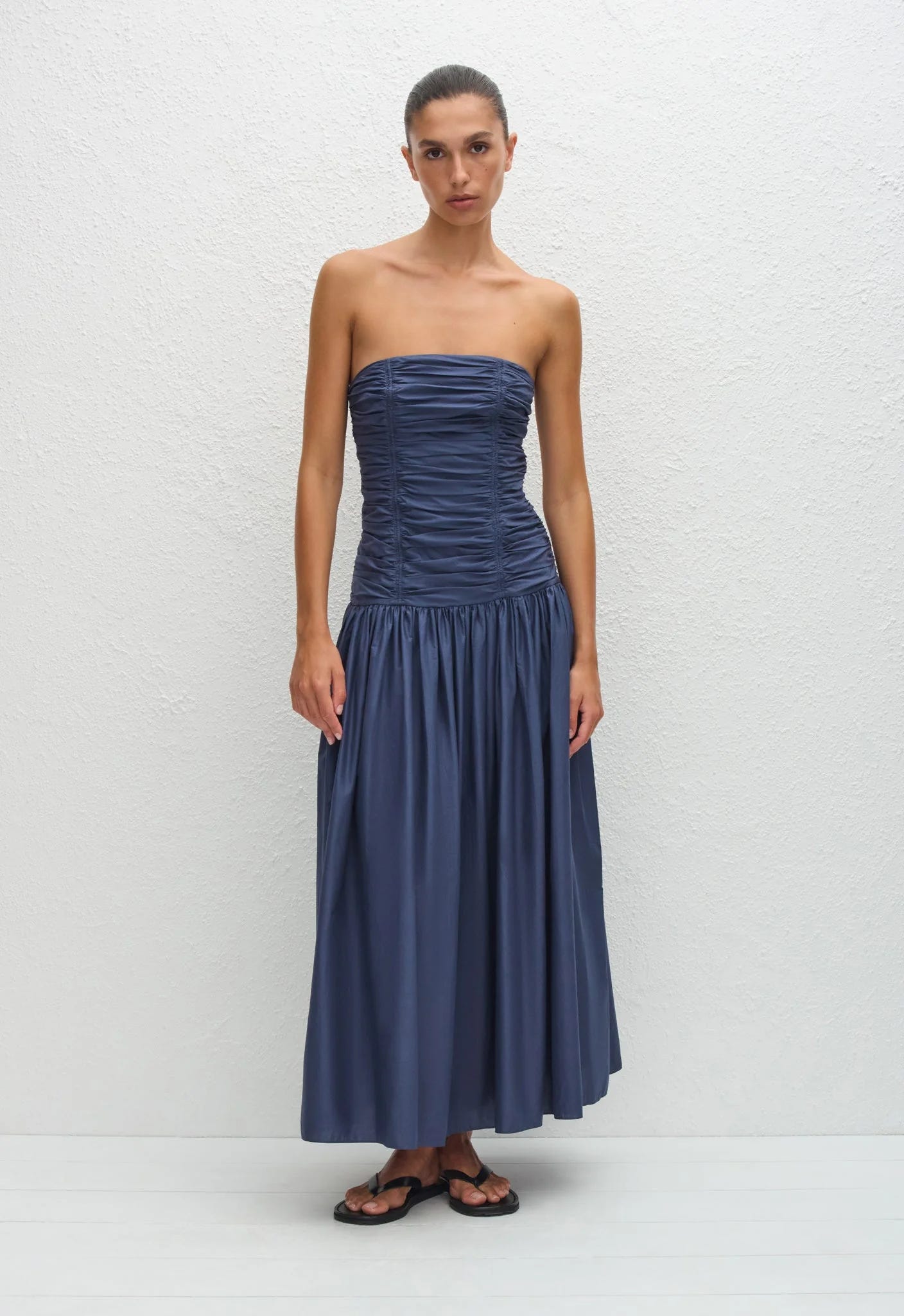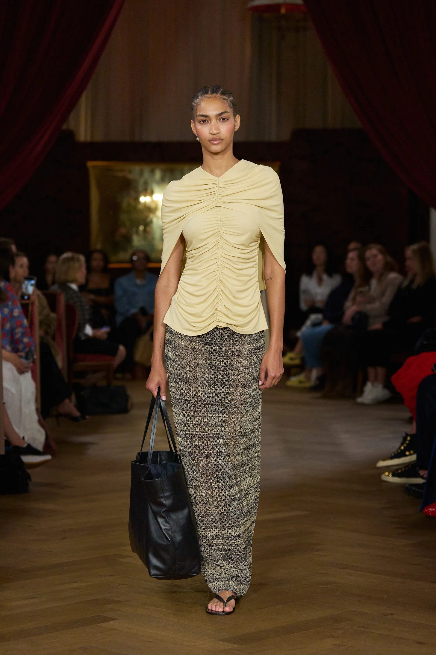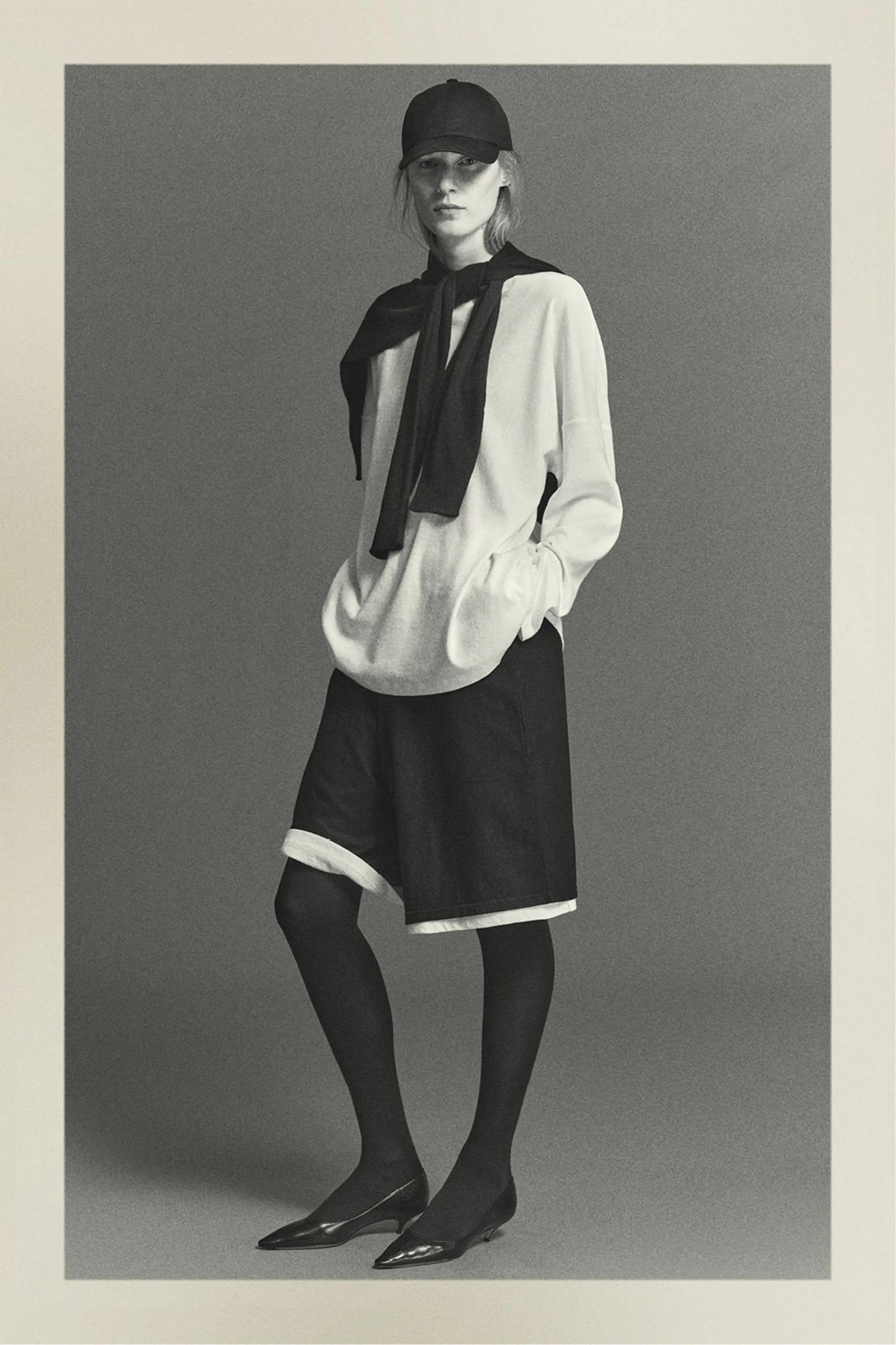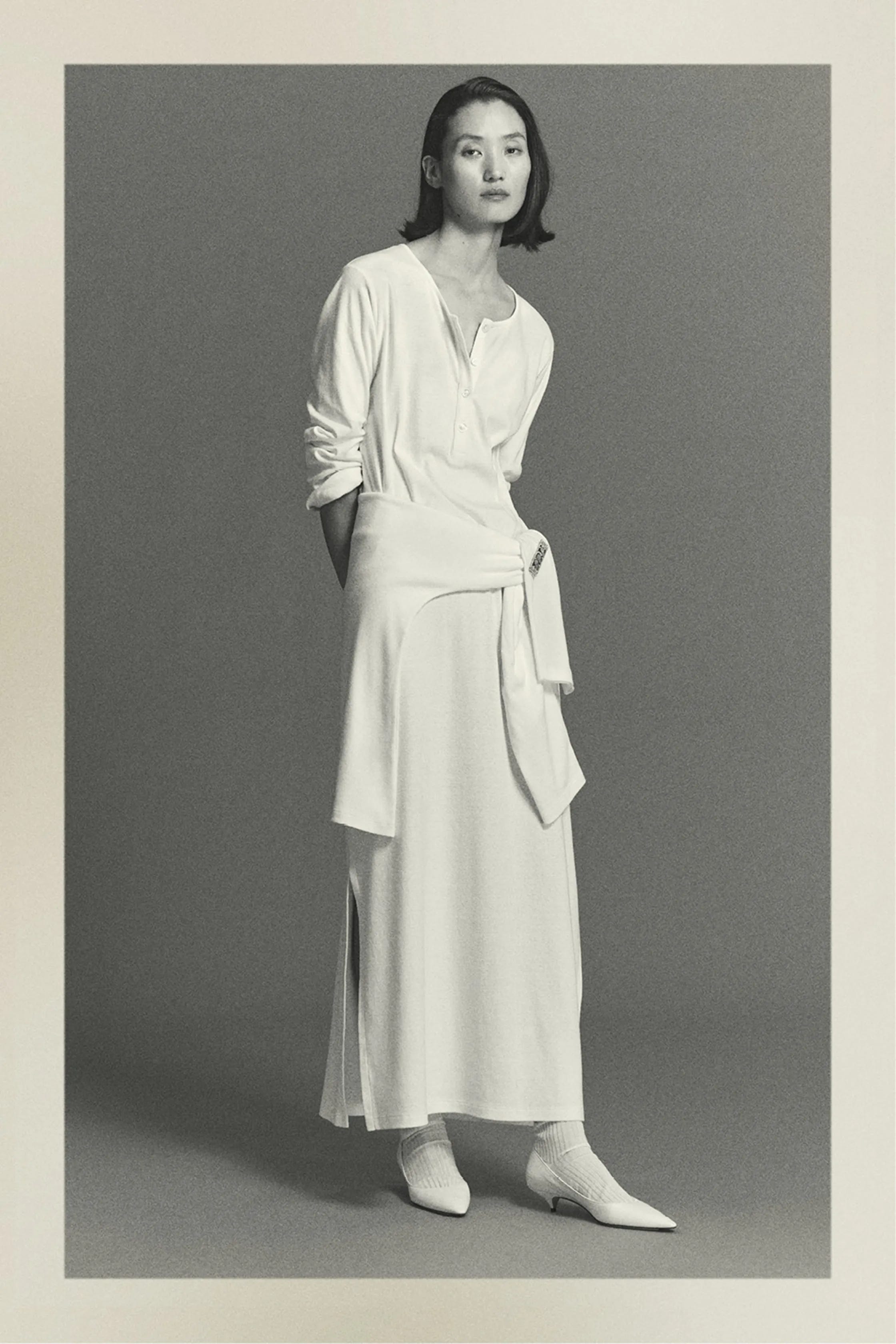 Over on Net-A-Porter, The Row’s spring has landed. From the lookbook released for this collection in June of last year, the simplest yet most striking piece was a pair of white, long-john-like underpinnings peeking through the hems of tailored shorts and trenches. To emulate this look, you could invest in the precise Larissa cotton jersey shorts or Kalyan pleated wool shorts and layer them over a more affordable pair of white Bermuda shorts. These from Filippa K or these on sale from Posse seem perfect for it. If these simple monochromatic looks are so visually pleasing, it might have to do with a simple styling principle. I have included a recent video I posted explaining this at the bottom of this email. Look 9 celebrated simplicity with the perfectly hanging Latoya white dress and Floris cotton jersey tee tied around the waist. If this diaphanous look draws you in, but the price tag doesn’t, this new gathered cotton dress from Staud has a very similar chic vibe.