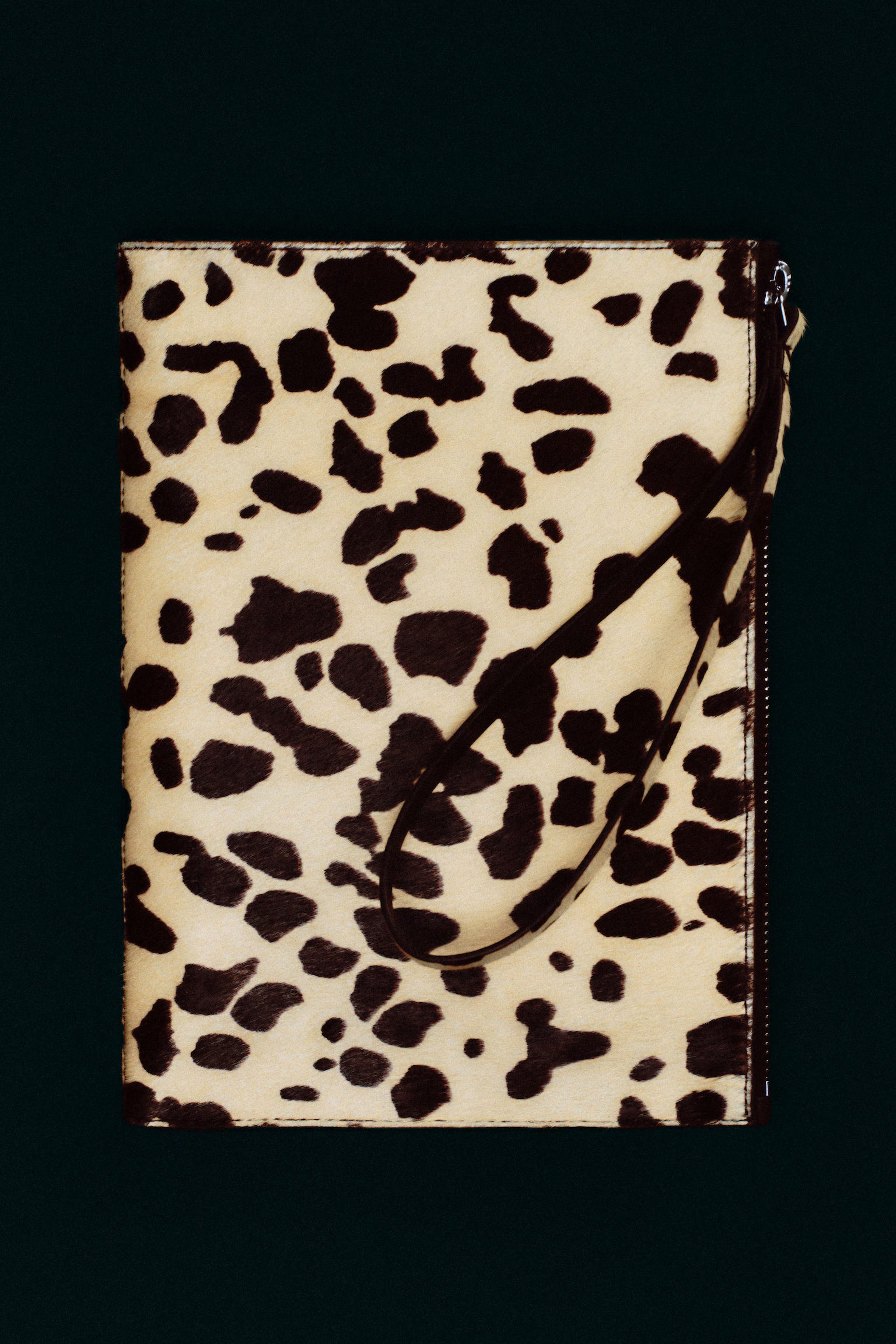 Speaking of, COS’ latest arrivals bring very good trousers — like these elasticized merino wool pants with a neat pintuck detail, these cotton barrel-cropped pants, which come sans waistband, and these well-cut tapered twill pants — and quirky accessories like the leopard print pony-hair-effect leather pouch below.