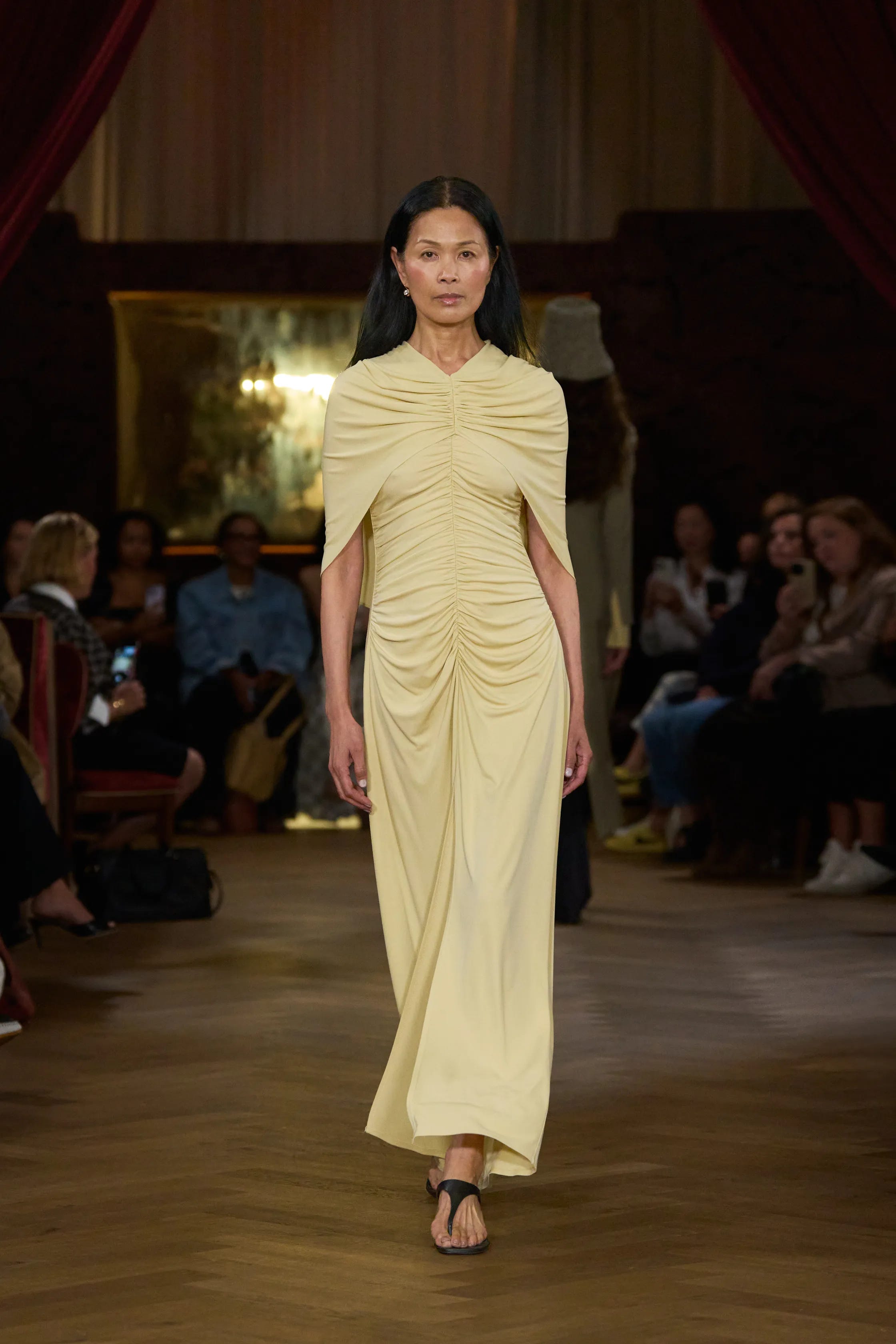 The first act of Kallmeyer spring has landed, and it’s awash in a calming jade-and-butter palette. The Matilda cape gown and Emme cape top feature ruching across the bodice and a cape overlay that drapes over the shoulders and back. The pepper tweed shrunken blazer and column-leg trousers make for a soft tailoring statement, especially when styled, as it was on the runway, with their slate-and-cream new multi-stripe tees tied around the waist. My favorite piece is the easy-to-wear Regina drawstring skirt in linen stripes.