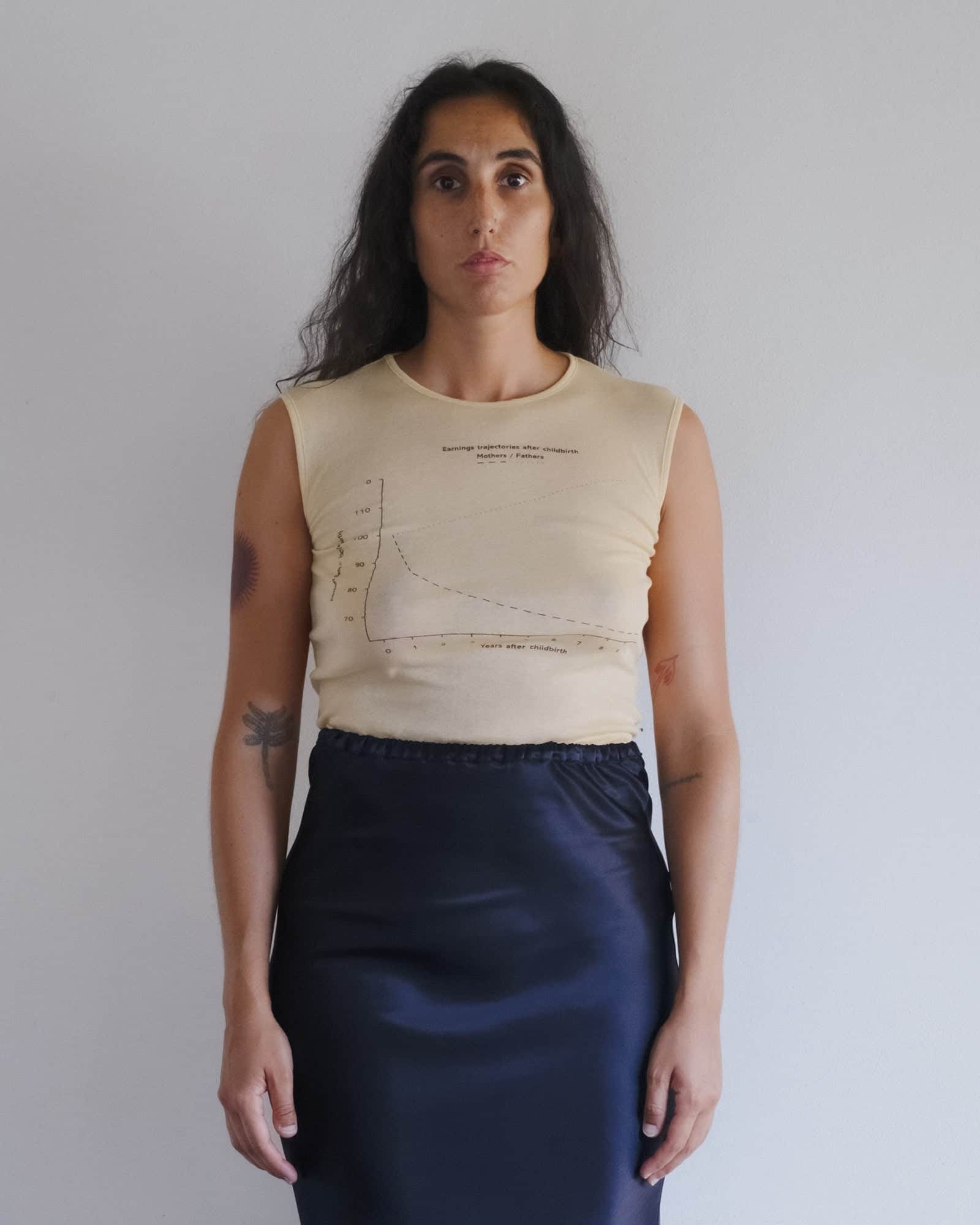 Baserange launched their Summer 2026 collection. The key seasonal colors you’ll find across their classic Vein and Omato tees are inky blue and cool greige. (I size up in these.) New styles like the silk satin skirt-over-pants and this crinkle linen square dress stand out. Among the pared-back crisp cotton pieces, you’ll find an outlier: a beige tank top with a graph printed on the front plotting mothers’ post-childbirth earnings trajectory vs. fathers. They called it the Unseen tank. Style it sans bra.
