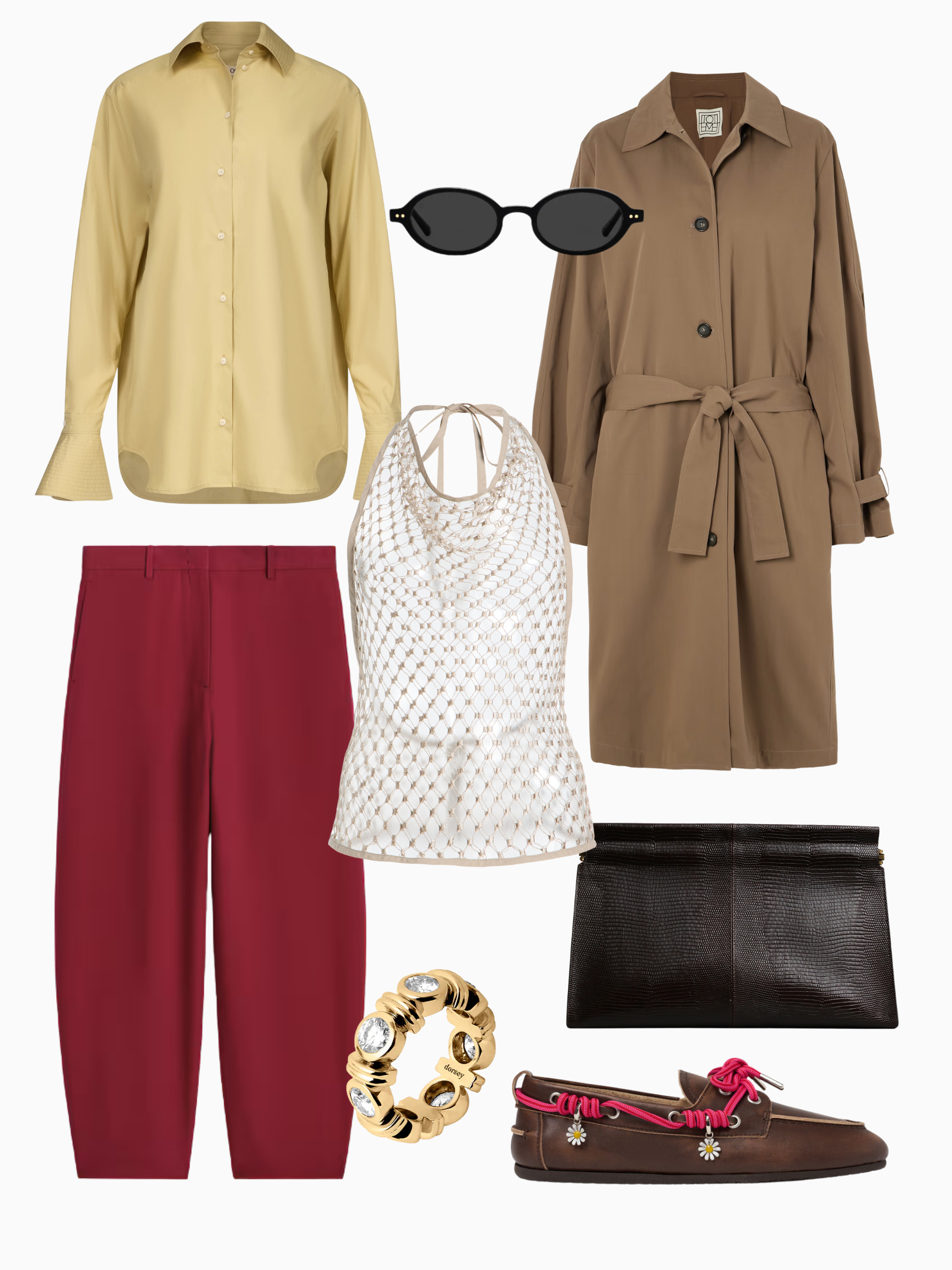 1. Shirt, Ossou; 2. Oval sunglasses, Jimmy Fairly; 3. Trench coat, TOTEME; 4. Silk tulip pants, COS; 5. Fishnet halter, Lemaire; 6. Moissanite ring, Dorsey; 7. Clutch, CO; 8. Charm boat shoes, Scarosso.