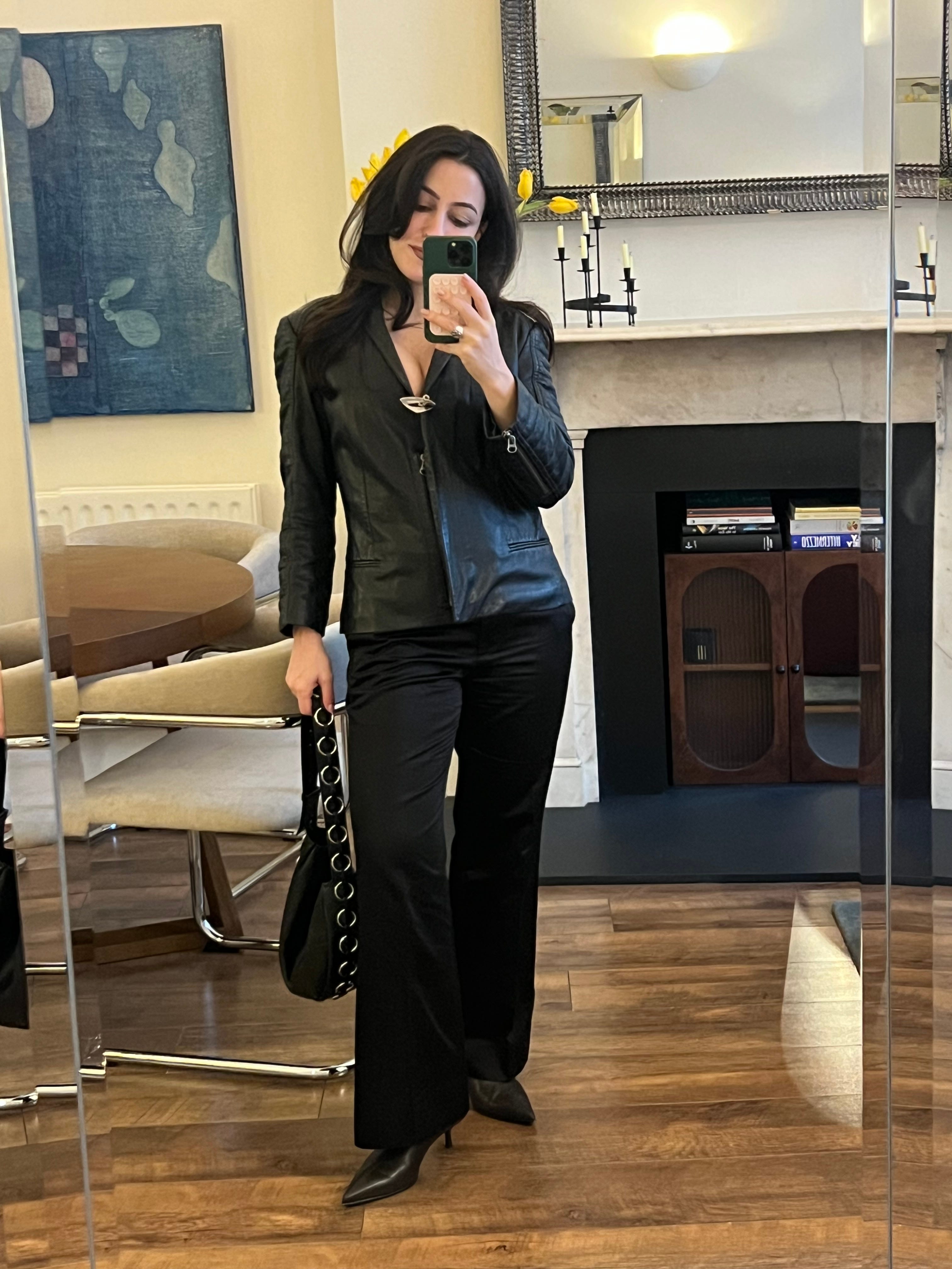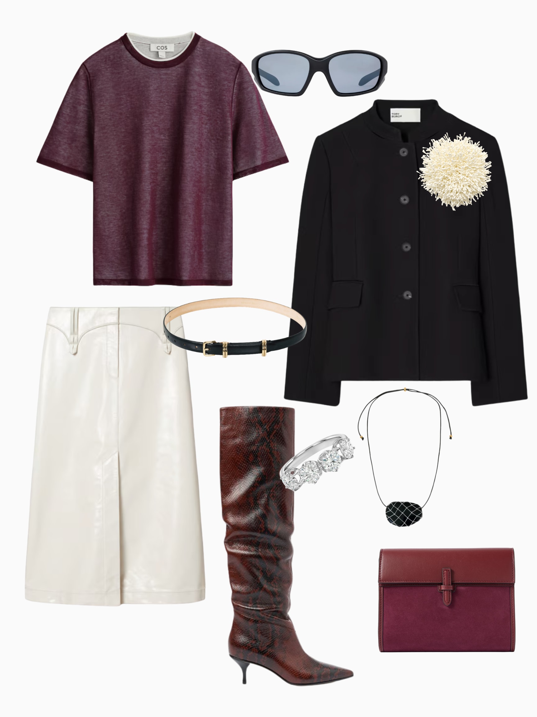 1. Layered top, COS; 2. Wrap sunglasses, Jimmy Fairly; 3. Crepe jacket, Tory Burch; 4. Brooch, by Malene Birger; 5. Leather skirt, Tory Burch; 6. Belt, Déhanche; 7. Slouchy boots, Scarosso; 8. Pinky ring, Dorsey; 9. Necklace, Heaven Mayhem; 10. Clutch, Hunting Season.