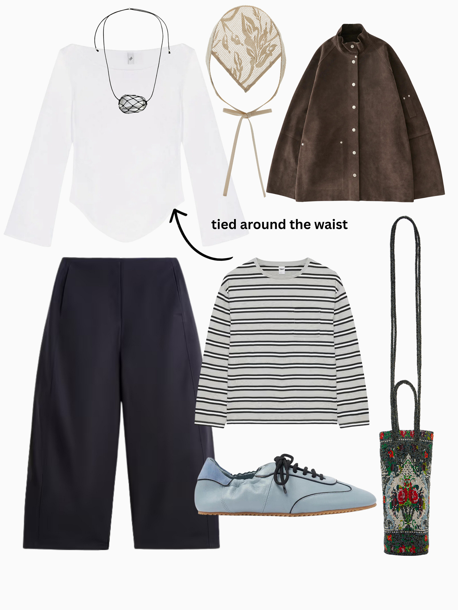 1. Long-sleeve tee, Coucou Intimates; 2. Necklace, Heaven Mayhem; 3. Headscarf, Soleil Soleil; 4. Suede jacket, Studio Nicholson; 5. Barrel pants, COS; 6. Striped tee, Aritzia; 7. Leather trainers, Scarosso; 8. Beaded bag, Cordera.